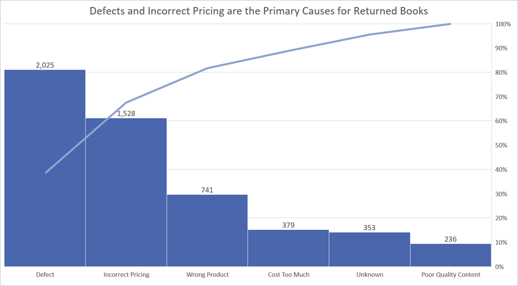 “What’s a Pareto Chart”, you ask? Think of a Pareto Chart as a traditional combination chart where a column chart represents data along the primary Y-axis, and a line chart represent a percentage along the secondary Y-axis. This type of chart is easily created with a standard combination chart, but the catch is that the data and the percentages must be contained within the original data source. A Pareto Chart only needs the data; the percentages and the line chart for the secondary Y-axis are inferred from the original data. Pareto Charts are typically sorted in descending order by category so that the line chart represent a running total of percentages as each category of displayed left to right along the X-axis.
