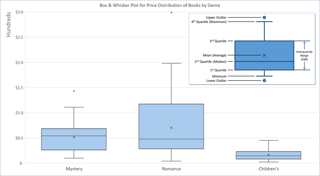 For a statistician, using functions like Min, Max, Average (Mean), Median, and Quartile are like a trip to the Magic Kingdom. The only downside to the Magic Kingdom is the drive there. Box & Whisker allows you to graphically represent all of the afore mentioned statistics without writing a single formula. All that is needed is the raw data, the chart will generate all of the answers.