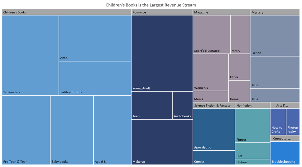 A Treemap is an ideal choice for comparing a category against other categories, as well as comparing sub-categories against one another. Treemaps display related data as a series of nested rectangles. Each initial rectangle represents a category and sized relative to one another. Within each single rectangle (category) are smaller rectangles that represent the sub-categories. Treemaps are one of the best ways to display large amounts of relativistic information in a small amount of space.