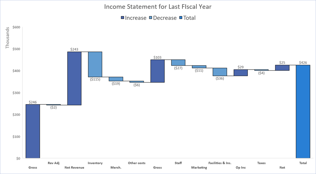 A Waterfall Chart allows the user to start with an initial value (a traditional column), and then graphically introduce positive and negative change relative to the initial value (represented as floating columns.) The Waterfall Chart may also show the point at which the transactions end and represent the end-point as a traditional column, just like the initial value. This method of displaying change relative to the start is an excellent way to highlight categorical change. For those of you who have ever tried to make a Waterfall Chart in previous versions of Excel, you know the frustration of building an “invisible chart” to support the floating columns. You’ll be happy to know that those days can be set to pasture.
