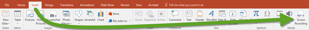 The Screen Recording feature will allow you to capture both video AND audio into a video file that can then be embedded into a PowerPoint slide. This eliminates the need for third-party software when creating simple screen recordings.