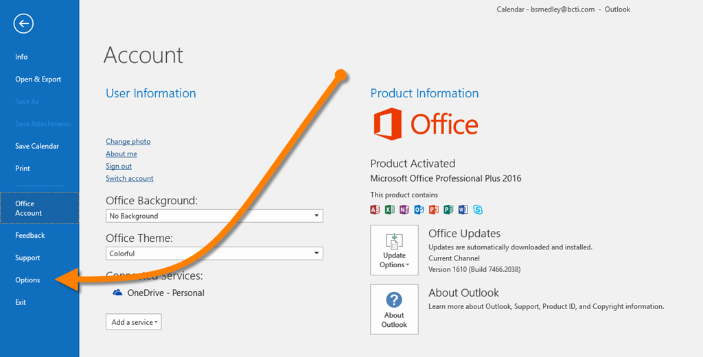 Click the OPTIONS category on the left to open the Outlook Options dialog box.