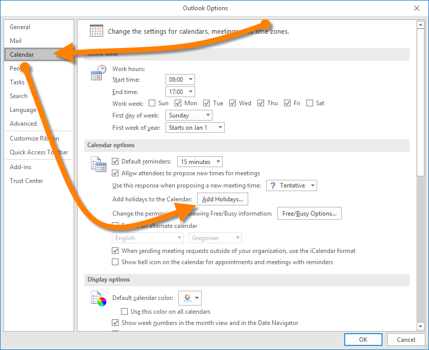 Click the CALENDAR category on the left. In the “Calendar Options” section, click the button labeled “Add Holidays…”.