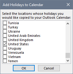 Select the location(s) of your choosing. This will imports all of the selected countries holidays and place them in your calendar.
