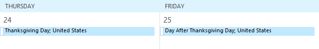 The holidays will present themselves as “All Day” events; this will allow you to still add normal appointments without appearing as if you’re are completely committed to the holiday.