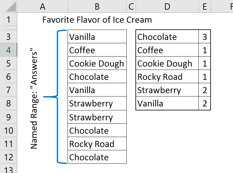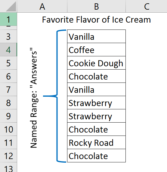 To set the stage, I have created a list of answers to the question, “What is your favorite flavor of ice cream?” I have named this range of 10 responses “Answers”. This will make the formulas a lot prettier.