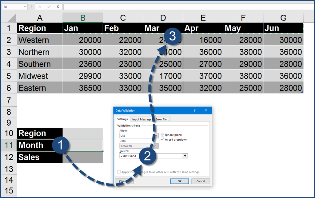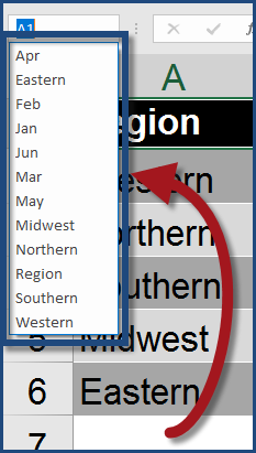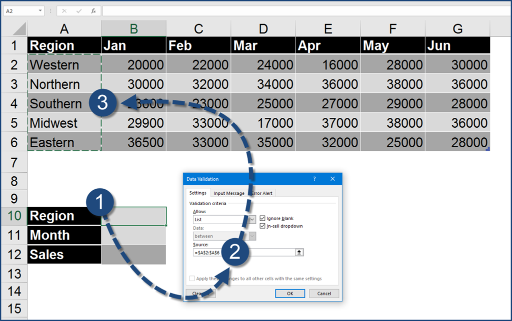 Create a data validation dropdown list using the region names. If you are not familiar with creating Data Validation dropdown lists, click here.