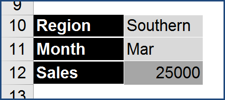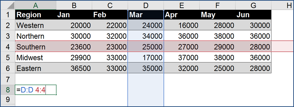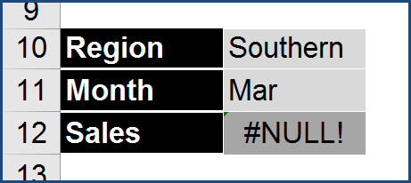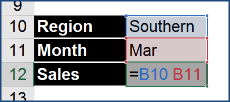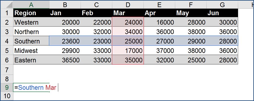 By using a “space” between two references, as in this case, the column that holds Mar and the row that holds Southern, you are asking Excel to return the information in the cell where those two ranges cross.