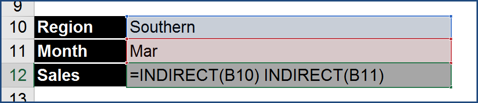=INDIRECT(“Southern”) INDIRECT(“Mar”)