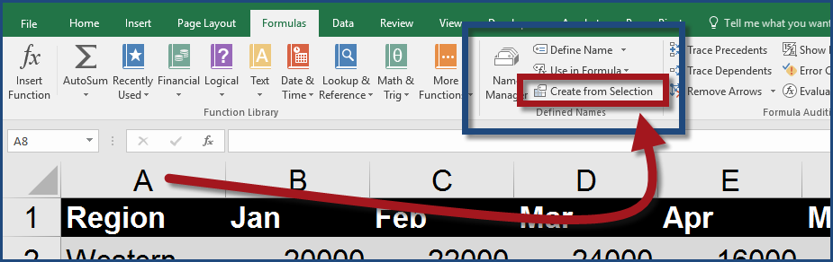 Select the data and then click on the FORMULAS tab and select “Create from Selection” located in the DEFINED NAMES group.