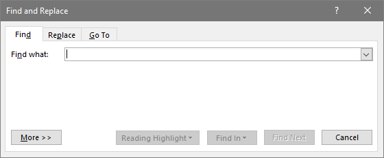 Somewhere along the way, Microsoft, in its infinite wisdom, decided to reprogram the oh-so-loved CTRL+F keyboard shortcut. Instead of opening a FIND dialog box, CTRL+F now opens the Navigation Pane.
