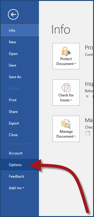 Launch Microsoft Word and then click the FILE tab and select OPTIONS.
