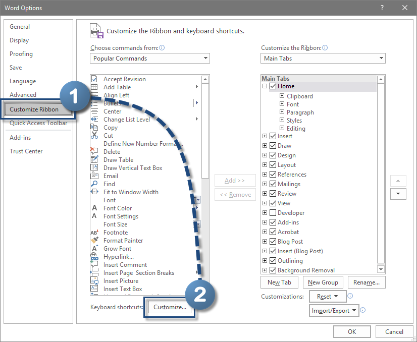 Click Customize Ribbon on the left side of the Word Options dialog box and then click the Customize… button at the bottom of the left column.