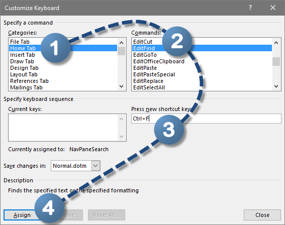 In the Categories: list (upper-left), click Home Tab. In the Commands: list (upper right), scroll down and select EditFind. In the Press new shortcut key: field, press and hold the CTRL key and then press the letter F. Click the Assign button in the lower-left corner of the Customize Keyboard dialog box.