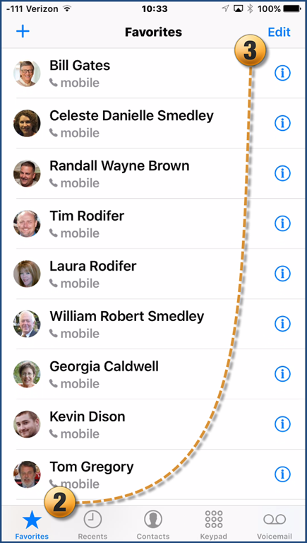 Open the PHONE app and select Favorites located at the bottom left corner of the screen (2). Press Edit (3) in the upper-right corner of the screen.