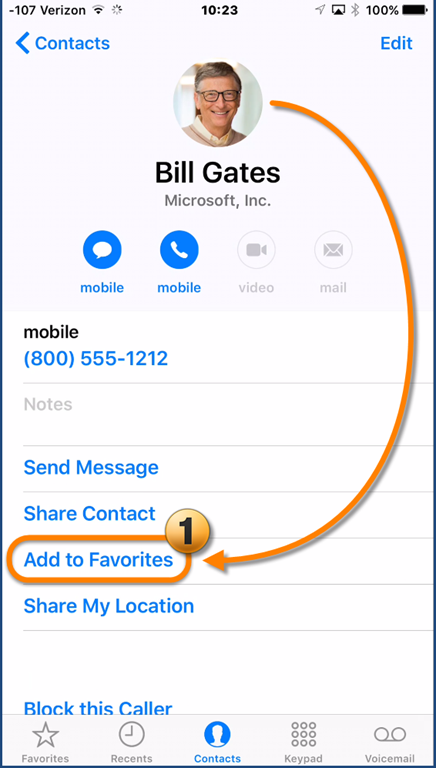 Open your CONTACTS app and select a person you wish to display as a favorite. Select “Add to Favorites” (1) and then select the phone number you with to dial when selected (i.e. Home, Work, Mobile, etc…)