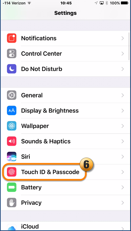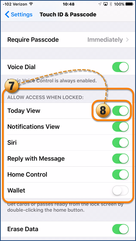Enter your passcode and then scroll down to the ALLOW ACCESS WHEN LOCKED: (7) section. In this section, activate Today View (8) by sliding the activity slider to the right. The button should have a green background when activated.