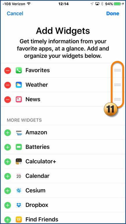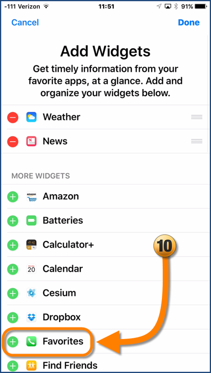 Scroll down into the More Widgets section and tap the green plus sign (10) to move the Favorites widget to the upper list.