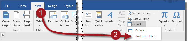 Click the downward pointing arrow to the right of the Object button and select Text from File…
