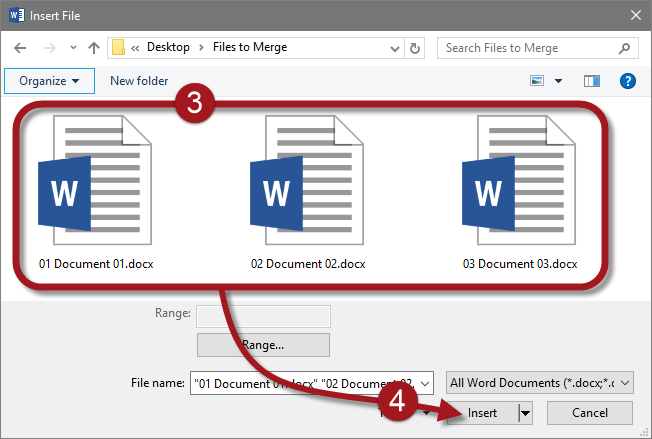 - If you select multiple documents for insertion, the files will be added in alphabetical order based on the filenames of the documents. If a specific order is desired, you may wish to copy all of the target files into a new folder and rename them something along the lines of “Doc1, Doc2, Doc3, etc…”