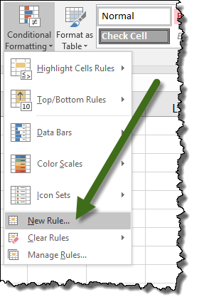 Select Home (Ribbon) –> Styles (Group) –> Conditional Formatting –> New Rule…