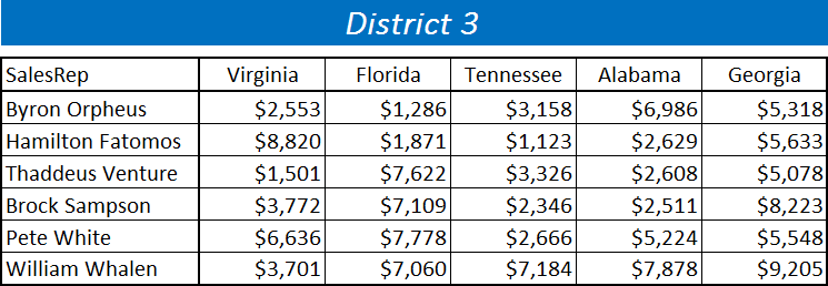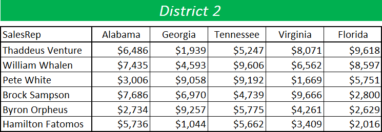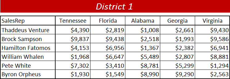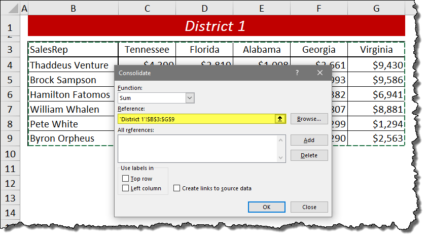 The objective is to consolidate all of the sales reps sales for each of the five states. The problem is we cannot simply create a 3D SUM function (i.e. =SUM(‘District1:District3’!B4)) that collects all of the numbers from each of the same cell addresses from each sheet. Notice how none of the sales reps are on the same row and none of the states are in the same columns. We would have to manually scan each cell and target them separately for each sales rep and state. Luckily, Excel has a tool that can figure this our for us in no time flat.