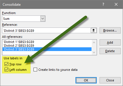 If you are consolidating data by similar cell addresses, leave these two options unchecked.