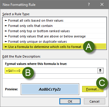 (B) In the Rule Description, enter the following rule: =$A1<>0