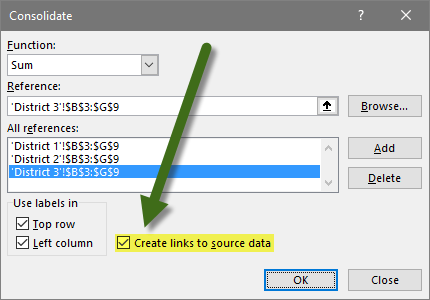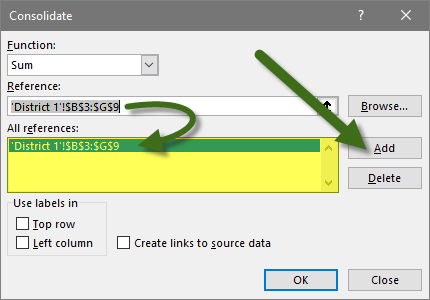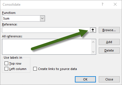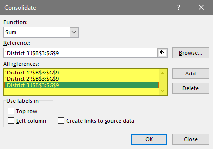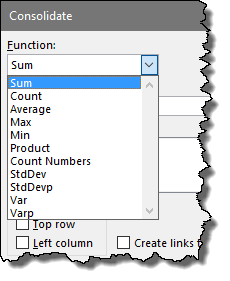 This will launch the Consolidate dialog box. Select the method of aggregation from the Function dropdown list (i.e. SUM).