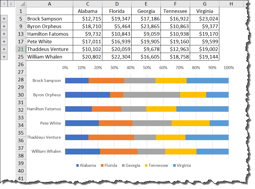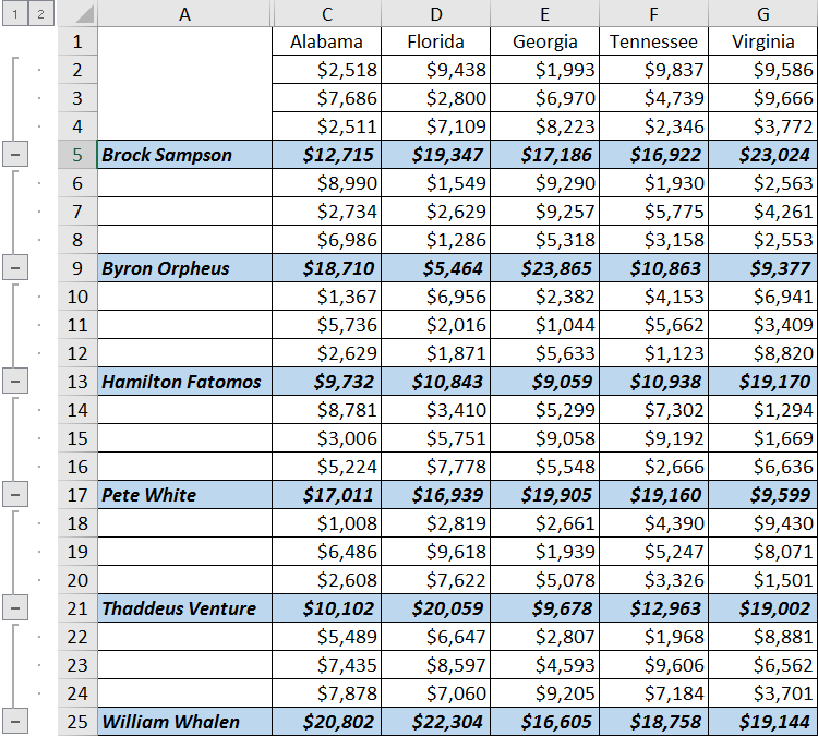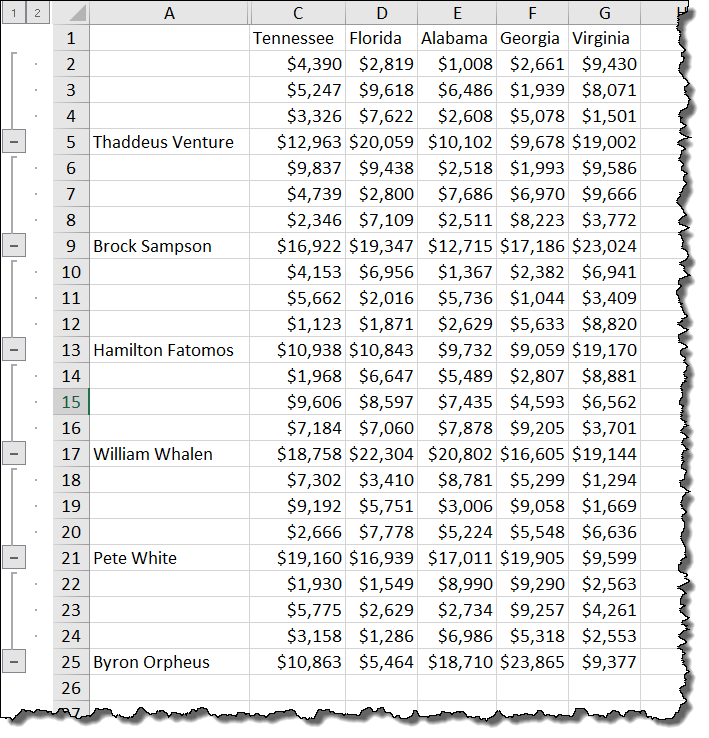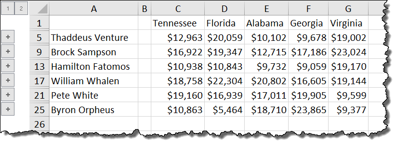 In addition, the aggregated data utilizes an outline structure that allows us to “drill down” into each of the sales reps totals to see what values make up the totals. This is because we checked the box labeled
