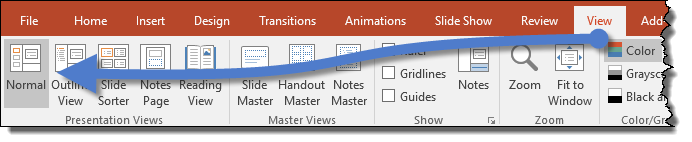 - Switch to the Normal view by selecting View (ribbon) –> Presentation Views (group) –> Normal