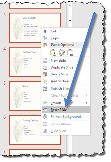 One of the unfortunate behaviors of importing slide content from a Word outline is that the text fonts and colors are based on the Word document and do not respond to design theme changes. To reset the slide to respond to theme changes, perform the following steps: