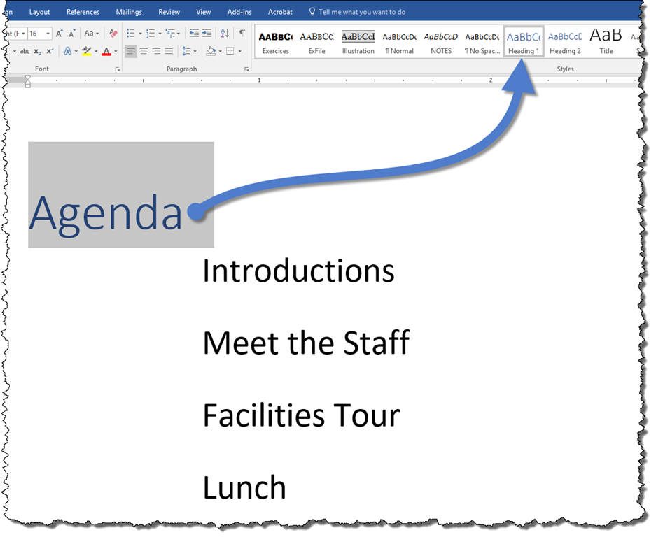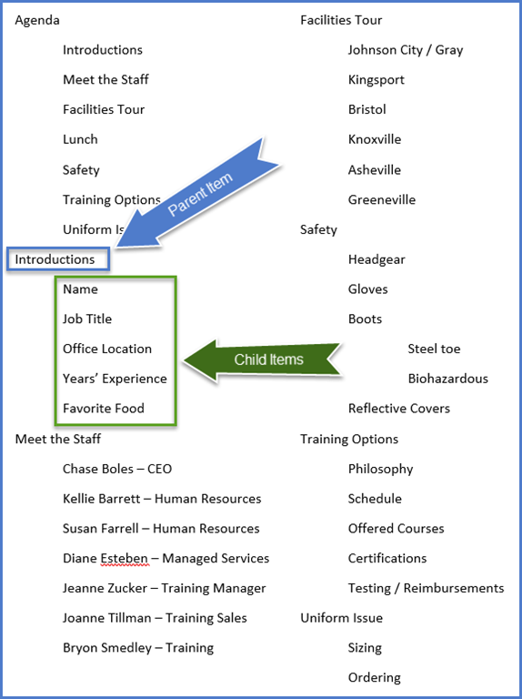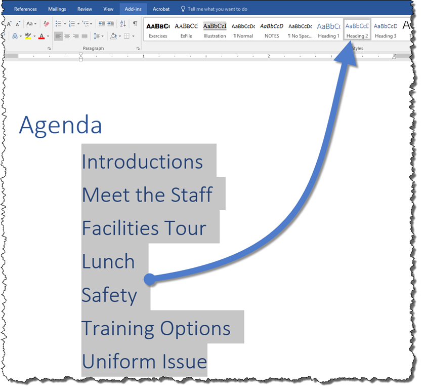 Select a group of child-level items and click the Heading 2 style from the Styles group on the Home ribbon. Repeat this step for each of the child-level items.