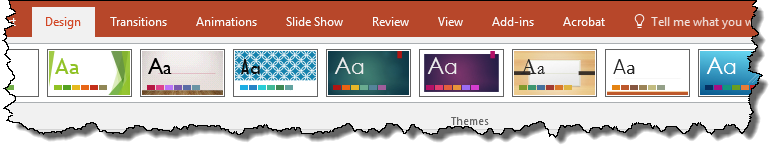 To easily apply artistic treatments to your slides, from the Design ribbon select a design of your choosing from the Themes gallery.
