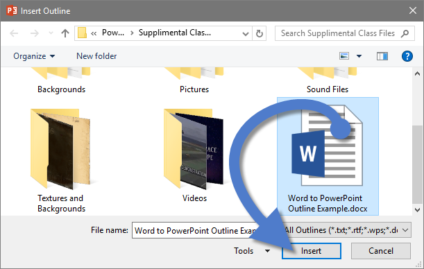 Navigate to and select the Word document containing the outline from the previous steps and select Insert.
