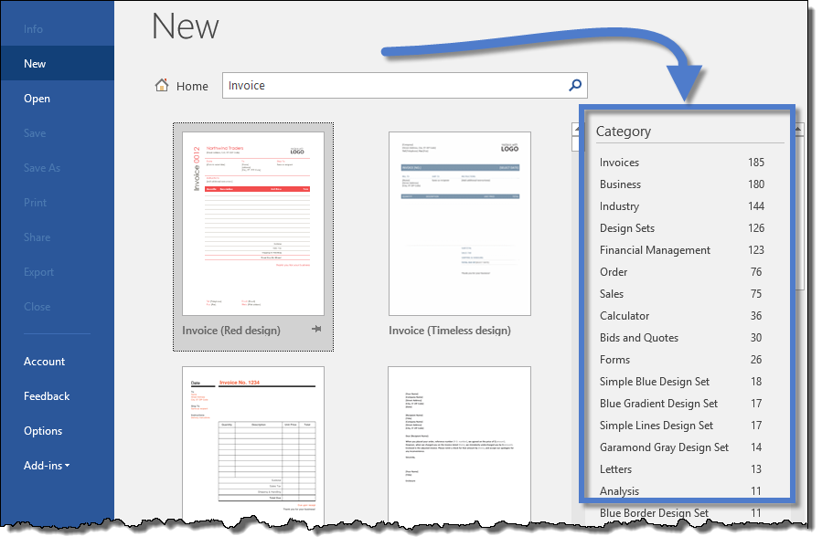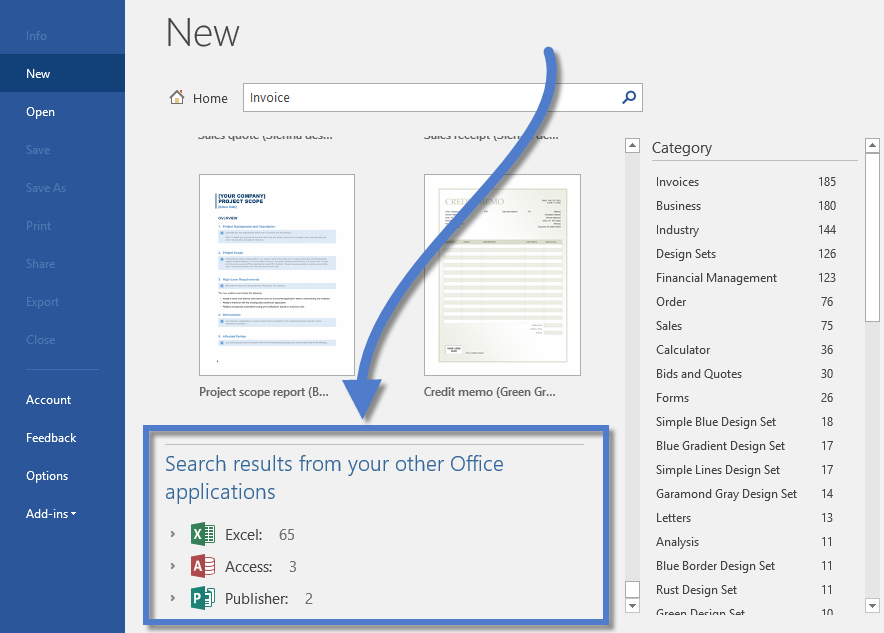 Starting in Office 2013, when a search is initiated, such as for a topic like “invoice”, Office doesn’t just search the application you are using, instead the search is performed across ALL of the installed Office applications. This is especially useful when a user may not be using the best application suited to the task at hand. Because a search could return hundreds of possible results, Office arranges the search results into categories.