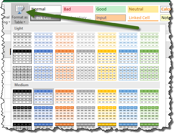 Select a list (perform this step separately for each list) and navigate to the Home ribbon. In the Styles group select Format as Table. Select the color scheme of your choice.