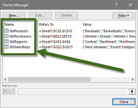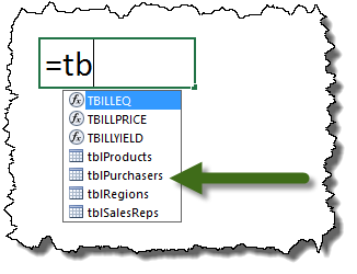 If the tables are prefaced with something like “tbl”, “t”, or “tb”, all of the tables will appear grouped together in the Name Manager and when using Excel AutoComplete feature during hand-typed formulas.