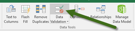 Select the cell where the dropdown list is to appear. From the Data ribbon, in the Data Tools group, select Data Validation.