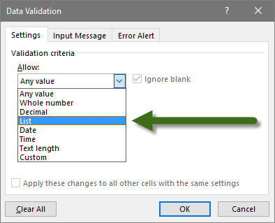 In the Data Validation dialog box, from the Allow dropdown, select List.