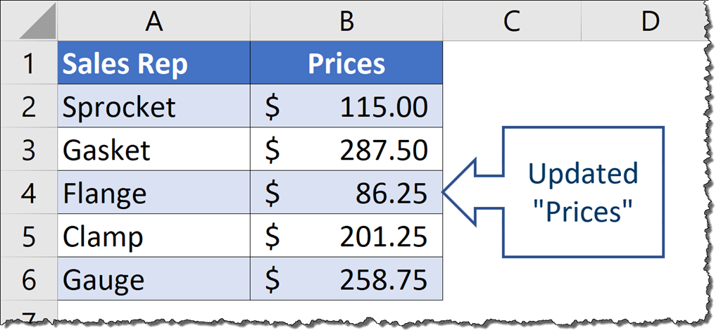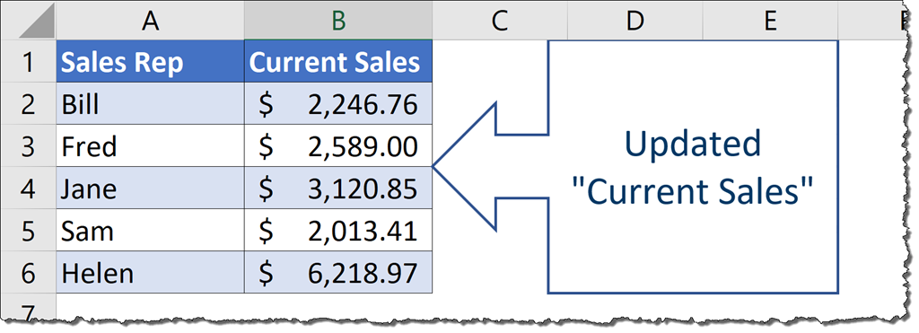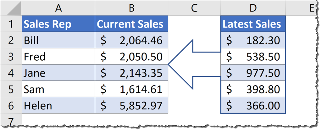 We could create a formula to add Bill’s “current sales” to his “latest sales” (i.e. =B2+D2) and store the answer in a new cell; then fill that formula down to calculate the same for the remaining sales reps. The issue here is that we don’t want to create a third list of number, which we would then copy and replace atop the older, out-of-date “current sales”. Here is how we can integrate the “latest sales” into the “current sales” without writing a single formula.