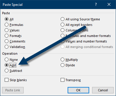 This will present the Paste Special dialog box. In the Operation section, select Add and click OK.