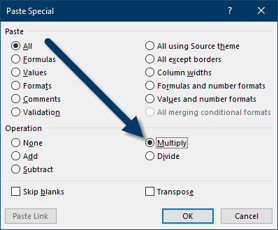 In the Paste Special dialog box, in the Operation section, select Multiply and click OK.