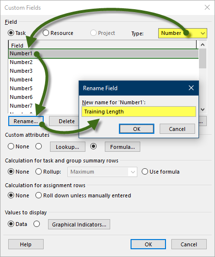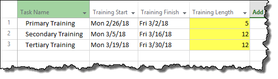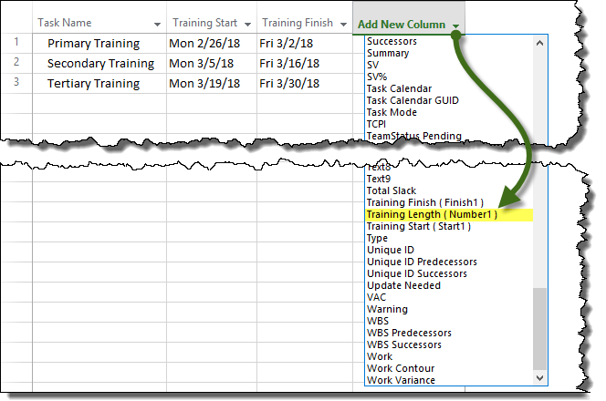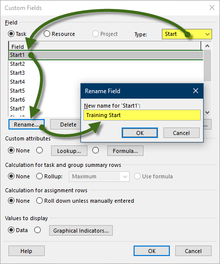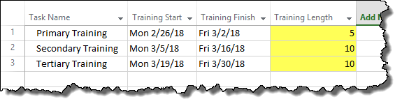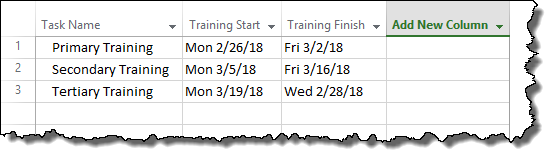 Repeat this process to create a field to hold the finish dates. Set the Type to “Finish” and rename the “Finish1” field accordingly (i.e. “Training Finish”.)