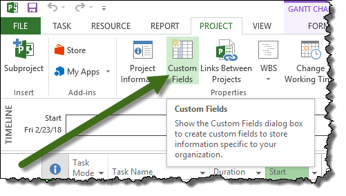 To create new fields to store start and finish dates, select the Project tab and navigate to the Properties group and select Custom Fields.