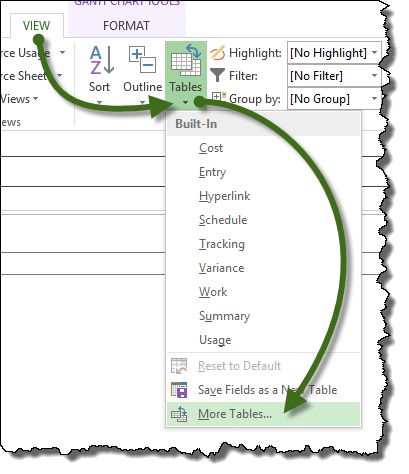 To create a new table to display the new start and finish date custom fields, select the View tab and navigate to the Data group and select Tables. From the Tables dropdown, select More Tables…