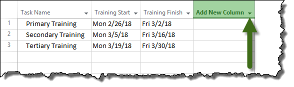 In the previously created custom table holding the start and finish information, click the small dropdown arrow to the right of the “Add New Column” heading.