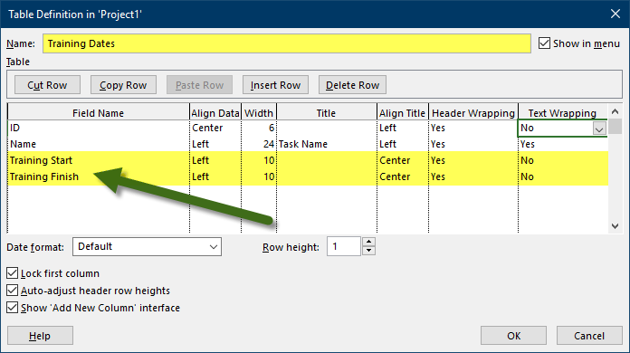 In the Table Definition dialog box, name the table accordingly (i.e. “Training Dates”) and add the “Training Start” and “Training Finish” custom fields to the list of table fields. Remove any unneeded fields form the list and click