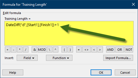 The DateDiff function will use the “d” parameter to calculate the number of days that occur between [Start1] and [Finish1]. Because no times are defined, the first day is not counted until the beginning of the second day is reached. Because of this behavior, the desired first day is not counted. To correct for this behavior, add 1 to the end of the calculation.