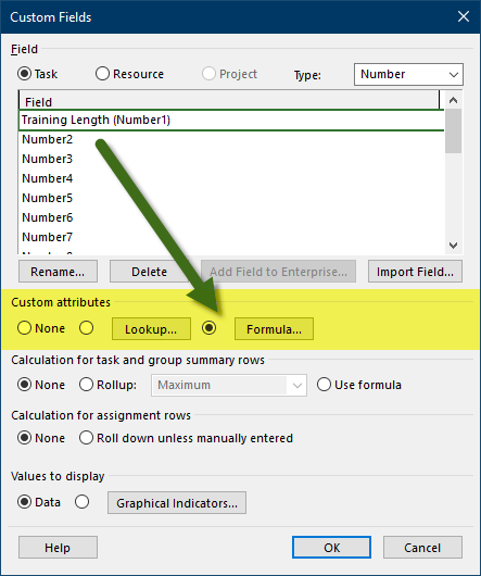 Using the same steps as defined earlier, create a new custom field to store the number of days between the custom start and custom finish dates. HINT: Use a “Number” type to store difference between the two dates. This is best because the answer is a number of days, not an actual date.
